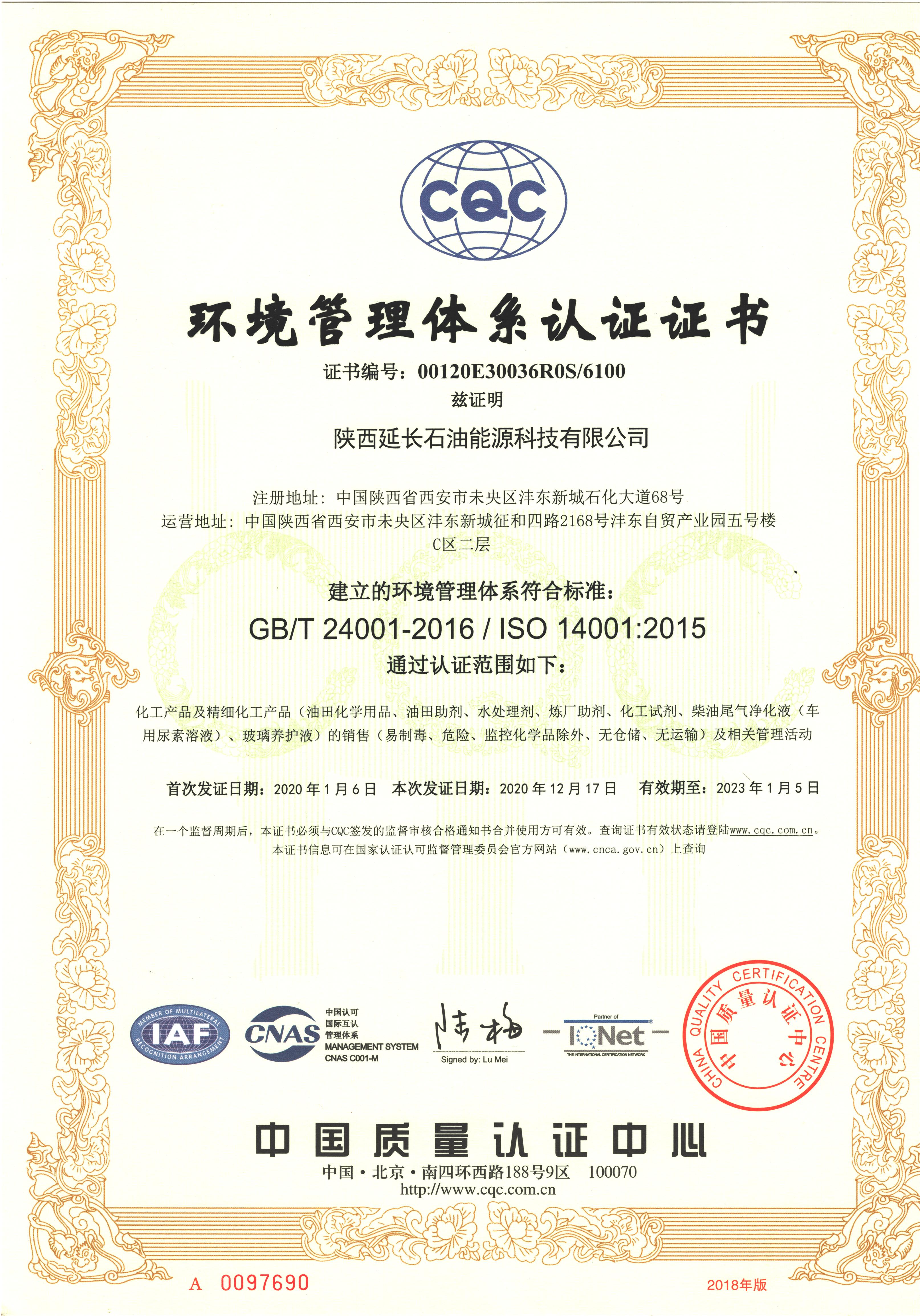 环境管理体系认证证书